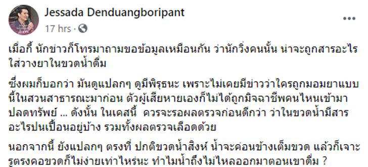 "เมื่อกี้ นักข่าวก็โทรมาถามขอข้อมูลเหมือนกัน ว่านักวิ่งคนนั้น น่าจะถูกสารอะไรใส่วางยาในขวดน้ำดื่ม ซึ่งผมก็บอกว่า มันดูแปลกๆ ดูมีพิรุธนะ เพราะไม่เคยมีข่าวว่าใครถูกมอมยาแบบนี้ในสวนสาธารณะมาก่อน ตัวผู้เสียหายเองก็ไม่ได้ถูกมิจฉาชีพคนไหนเข้ามาปลดทรัพย์ ... ดังนั้น ในเคสนี้ ควรจะรอผลตรวจก่อนดีกว่า ว่าในขวดน้ำมีสารอะไรปนเปื้อนอยู่บ้าง รวมทั้งผลตรวจเลือดด้วย นอกจากนี้ ยังแปลกๆ ตรงที่ ปกติขวดน้ำ... น้ำจะค่อนข้างเต็มขวด แล้วก็เจาะรูตรงคอขวดก็ไม่ง่ายเท่าไหร่นะ ทำไมน้ำถึงไม่ไหลออกมาตอนเขาดื่ม ?"
