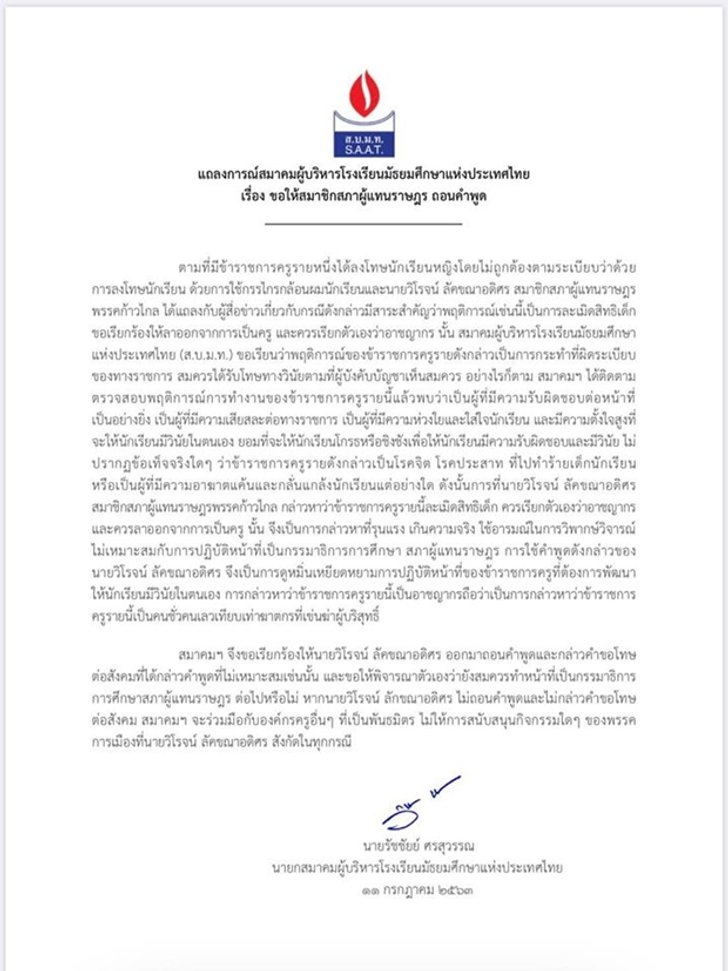 ครูฉันเป็นคนดี? สมาคมผู้บริหารโรงเรียนมัธยมฯ เดือด จี้ "วิโรจน์" ถอนคำพูดกล่าวหาว่าครูตัดผมนักเรียนหญิงแหว่งเป็นอาชญกร ขู่บอยคอตพรรคก้าวไกล