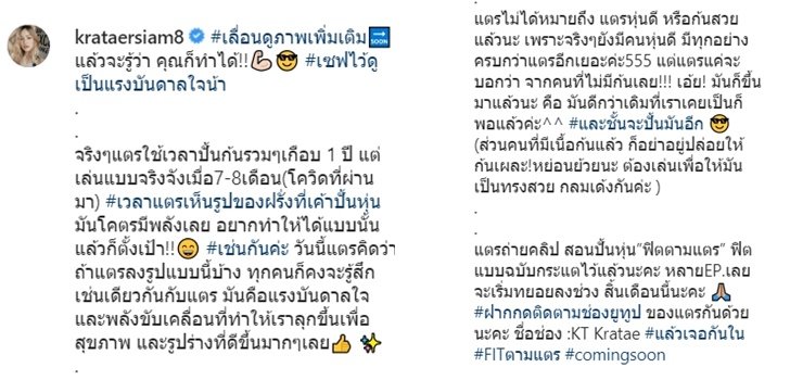 พอลงรูปเสร็จ กระแตก็เขียนต่ออีกว่ามีหลายๆ คนที่หุ่นดีกว่าเธอ แต่เธอก็อยากบอกทุกคนว่าการปั้นบั้นท้ายไม่ใช่เรื่องที่เป็นไปไม่ได้ เพราะเธอเองก็ได้พิสูจน์แล้วว่าตัวเองก็สามารถทำได้ โดยโพสต์ดังกล่าวมีแฟนๆ เข้าไปกดถูกใจและคอมเมนต์จำนวนมาก
