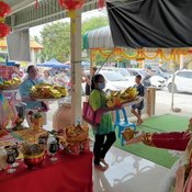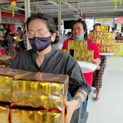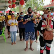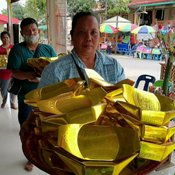 ขณะที่ นางอภิญญา วัย 39 ปี ชาวจังหวัดพังงา ได้เดินทางมาพร้อมครอบครัวและเพื่อนๆ จากจังหวัดพังงา ได้ร่วมกันนำทองคำ พร้อมด้วยสร้อยคอทองคำ บรรจุในหีบทองมูลค่ากว่า 100 ล้านบาท ตั้งขบวนแห่รอบรูปปั้นอาตี๋สำเภาทอง จำนวน 3 รอบ ตามที่ได้ทำการบนบานสานกล่าวไว้ หลังจากถูกสลากรับโชครวมกันกว่า 7 แสนบาท โดยในขบวนแห่มีชาวบ้านที่เดินทางมาขอเลขเด็ดจากอาตี๋สำเภาทอง ต่างมาร่วมกันแบกเงินแบกทอง ร้องโห่ร่วมกับขบวนด้วยเพื่อความเป็นสิริมงคล และขอโชคขอลาภหวังมีโชคในงวดนี้ด้วย