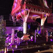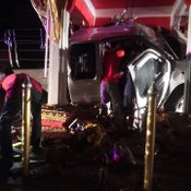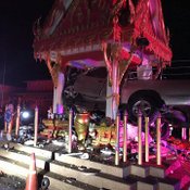 นักเสี่ยงโชคแห่ส่องทะเบียนรถ หลังกระบะซิ่งฝ่าสายฝน พุ่งชนศาลหลักเมืองลำทะเมนชัย