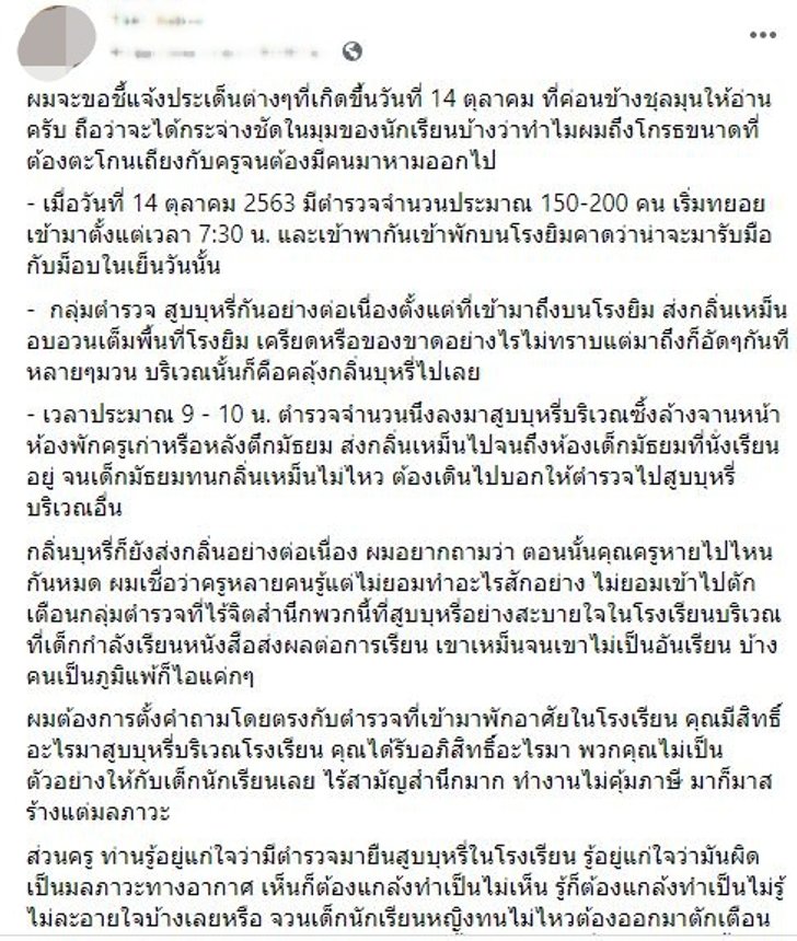 ผมต้องการตั้งคำถามโดยตรงกับตำรวจที่เข้ามาพักอาศัยในโรงเรียน คุณมีสิทธิ์อะไรมาสูบบุหรี่บริเวณโรงเรียน คุณได้รับอภิสิทธิ์อะไรมา พวกคุณไม่เป็นตัวอย่างให้กับเด็กนักเรียนเลย ไร้สามัญสำนึกมาก ทำงานไม่คุ้มภาษี มาก็มาสร้างแต่มลภาวะ