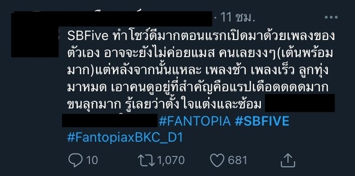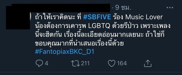 กลายเป็นประเด็นที่ถูกพูดถึงอย่างมาก จากการแสดงโชว์ของวง SBFIVE บนเวทีคอนเสิร์ต FANTOPIA (แฟนโทเปีย) ที่อิมแพ็คอารีน่า เมืองทองธานี เมื่อคืนวานนี้ (21 พ.ย.) ซึ่งช่วงหนึ่งของการแสดง 3 หนุ่มจากวง SBFIVE นำโดย คิมม่อน วโรดม เข็มมณฑา, คอปเตอร์ ภานุวัฒน์ เกิดทองทวี และ บาส สุรเดช พินิวัตร์ ได้มีการแร็ปเสียดสีรัฐบาล ก่อนจะจบโชว์ของเพลงดังกล่าวด้วยการชู 3 นิ้ว