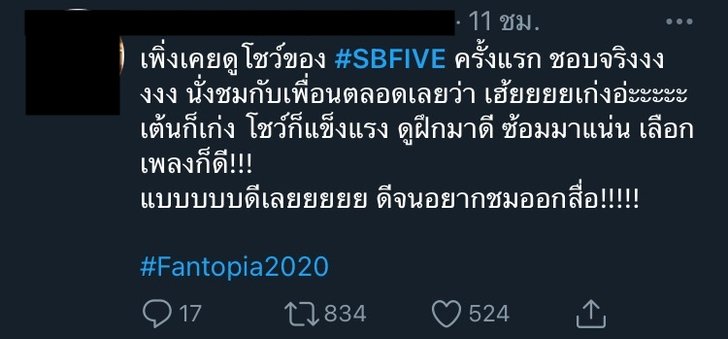 คลิปการโชว์ช่วงดังกล่าว ทวิตเตอร์ของ Star Hunter Entertainment ต้นสังกัดวง SBFIVE ได้นำมาโพสต์ในลงโซเชียลมีการรีทวีตไปมากมาย และมีคนเข้ามาชมแล้วเกิน 1 หมื่นครั้ง