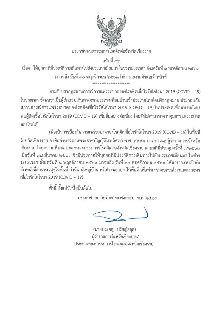 นายประจญ ปรัชญ์สกุล ผู้ว่าราชการ จ.เชียงราย ลงนามในคำสั่งให้บุคคลที่เดินทางไปยังประเทศเมียนมา ในช่วงวันที่ 1 พ.ย. จนถึง 30 พ.ย. รายงานตัวต่อเจ้าหน้าที่ด้านสาธารณสุข กำนัน ผู้ใหญ่บ้าน หรือโรงพยาบาลในท้องถิ่น เพื่อสกัดการแพร่ระบาดของโรคติดเชื้อไวรัสโคโรนา 2019 (โควิด-19)