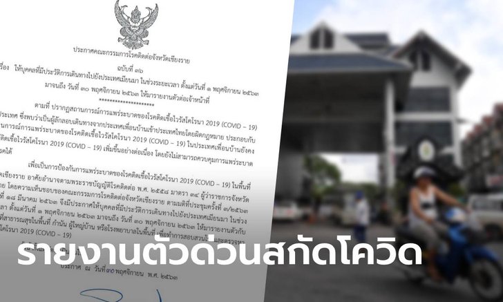 "ประกาศให้บุคคลที่มีประวัติการเดินทางไปยังประเทศเมียนมา ในช่วงระยะเวลา ตั้งแต่วันที่ 1 พ.ย. 2563 มาจนถึงวันที่ 30 พ.ย. 2563 ให้มารายงานตัวกับเจ้าหน้าที่สาธารณสุขในพื้นที่ กำนัน ผู้ใหญ่บ้าน หรือโรงพยาบาลในพื้นที่ เพื่อทำการสอบสวนโรคและตรวจหาเชื้อไวรัสโคโรนา 2019" เอกสารดังกล่าว ระบุ