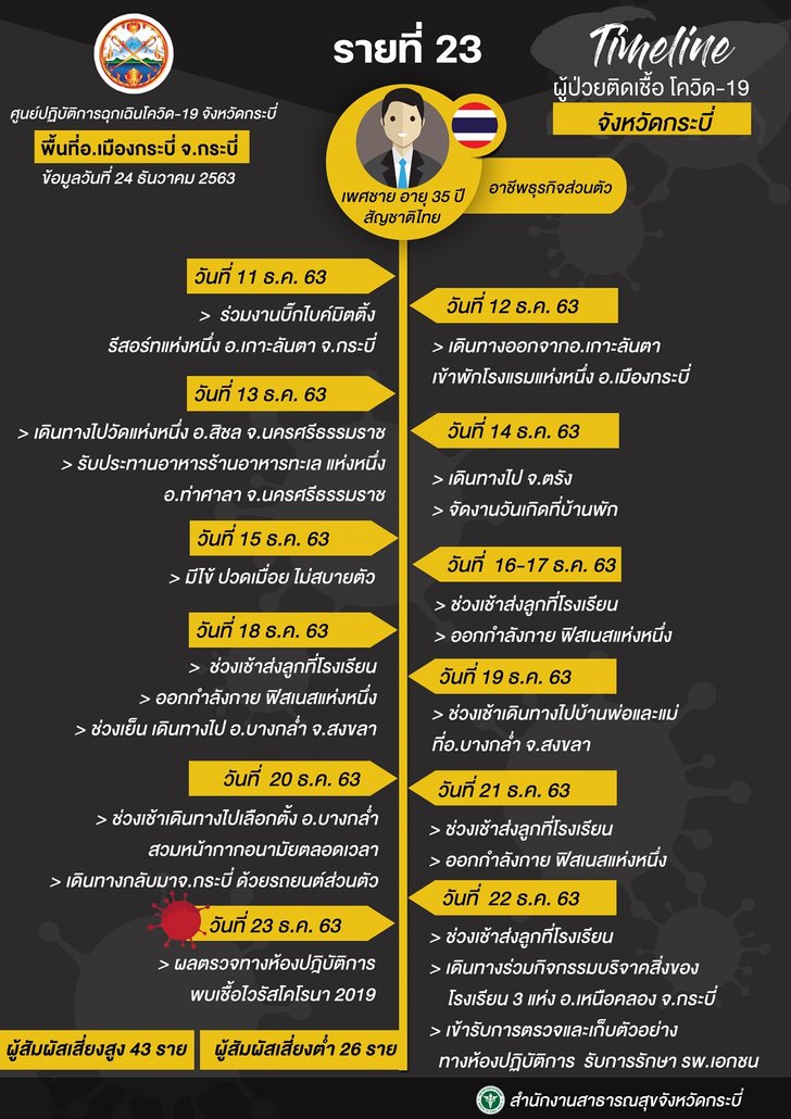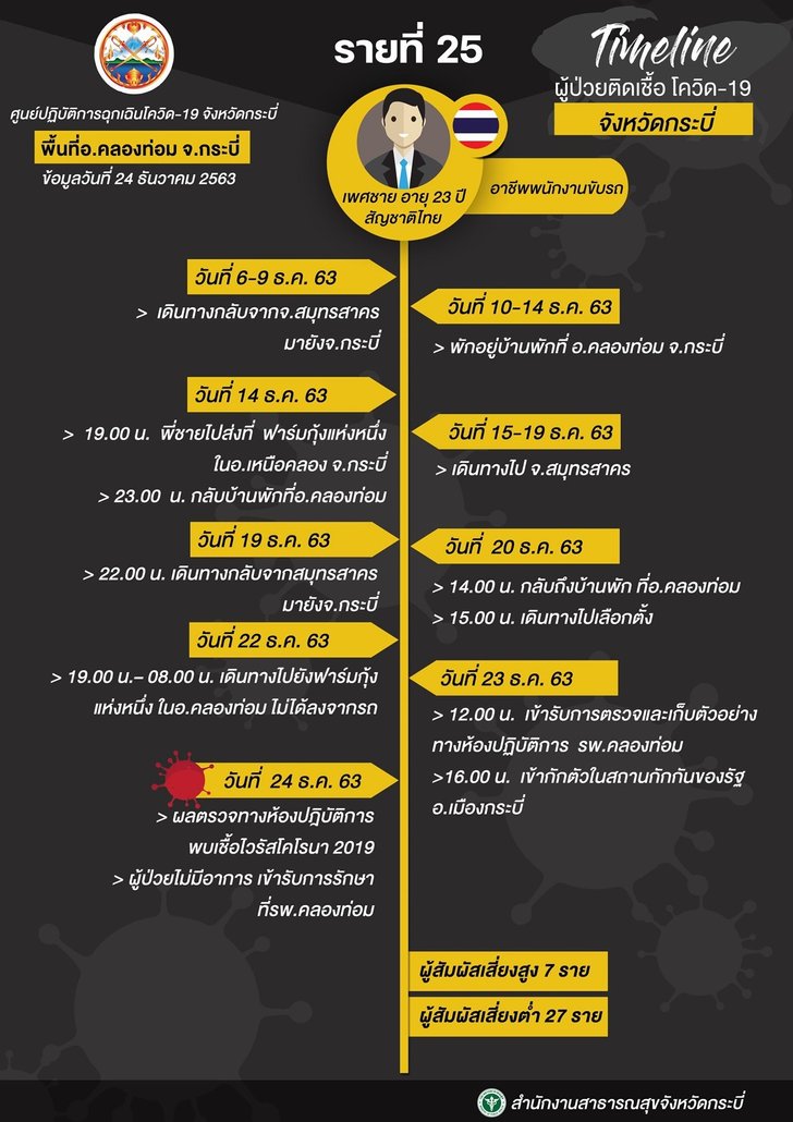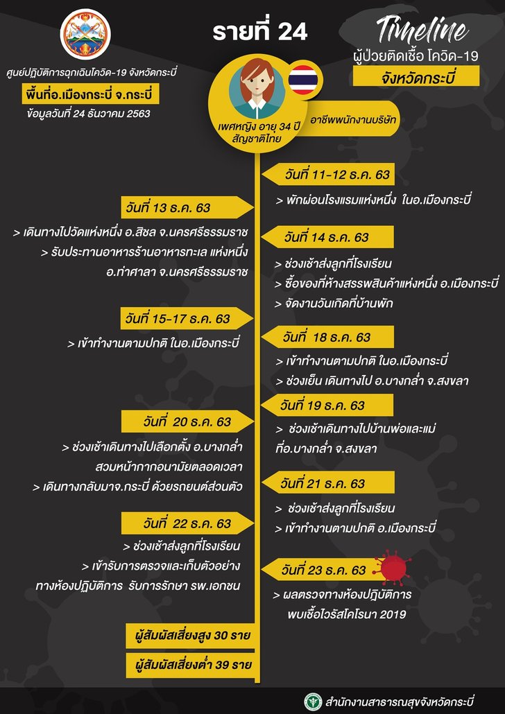 วันที่ 24 ธค.63 ผู้สื่อข่าวรายงานว่า สำนักงานสาธารณสุขจังหวัดกระบี่ ได้เผยไทม์ไลน์ของผู้ป่วยโควิด 3 ราย ซึ่งตรวจพบเชื้อและแถลงข่าวไปเมื่อวานนี้(24 ธ.ค.) ซึ่งรายแรก เป็นหนุ่มวัย 35 ปี เป็นเจ้าของโรงแรมแห่งหนึ่งในเมืองกระบี่ และเป็นสามีของพนักงานสาวแบงค์อายุ 34 ปี ซึ่งทั้ง 2 คน ติดเชื้อโควิด-19 และอีกรายเป็นหนุ่มวัย 23 ปี ติดเชื้อโควิดหลังไปส่งกุ้งที่สมุทรสาคร