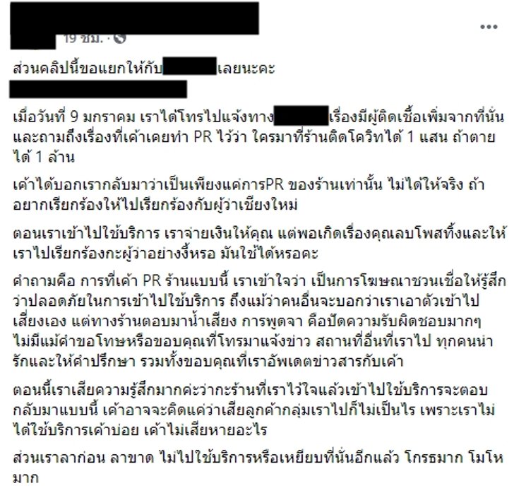 ตอนเราเข้าไปใช้บริการ เราจ่ายเงินให้คุณ แต่พอเกิดเรื่องคุณลบโพสต์ทิ้งและให้เราไปเรียกร้องกับผู้ว่าฯ อย่างงี้เหรอ มันใช้ได้เหรอคะ คำถามคือ การที่เค้า PR ร้านแบบนี้ เราเข้าใจว่าเป็นการโฆษณาชวนเชื่อให้รู้สึกว่าปลอดภัยในการเข้าไปใช้บริการ