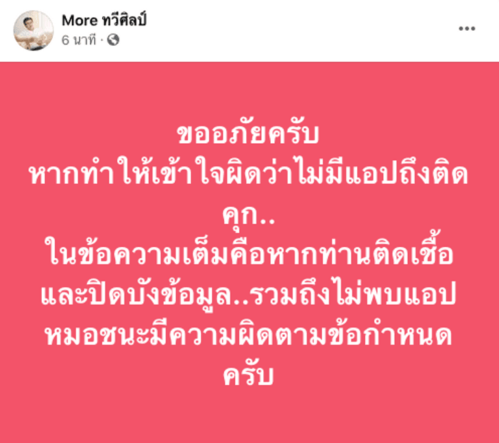 "ขออภัยครับ หากทำให้เข้าใจผิดว่าไม่มีแอปถึงติดคุก ในข้อความเต็มคือหากท่านติดเชื้อ และปิดบังข้อมูล รวมถึงไม่พบแอปหมอชนะมีความผิดตามข้อกำหนดครับ"